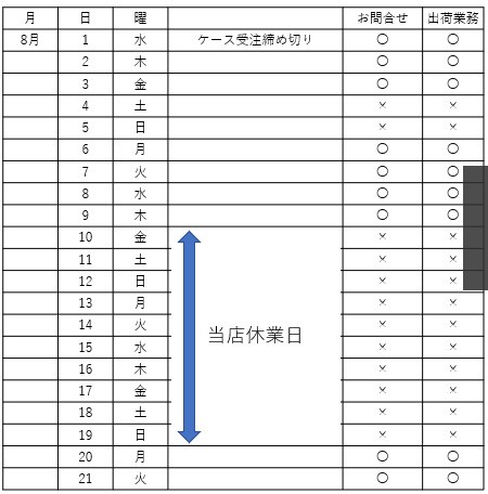 誠に勝手ながら、当店では、以下の日程にてお盆休業を頂戴いたします。